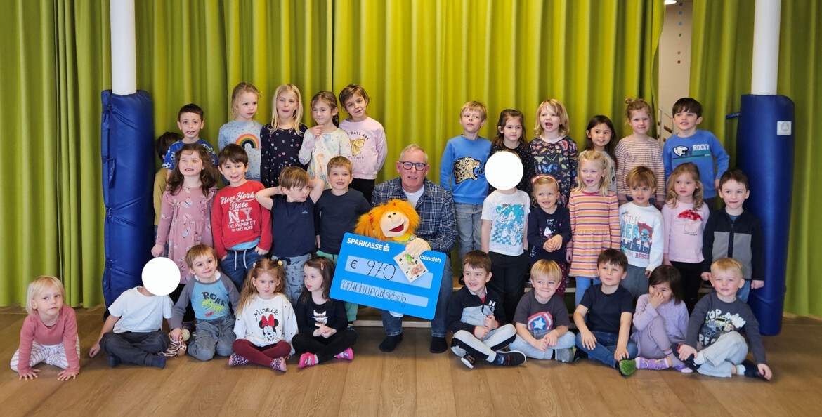 Emanuel Freilinger, Leitung Pro Juventute Fundraising, durfte die großzügige Spende persönlich entgegennehmen – begleitet von Tina, der Handpuppe. Gemeinsam erklärten sie den Kindern, warum manche Kinder bei Pro Juventute leben und wie wertvoll solche Spenden für ihre Förderung und Unterstützung sind.
